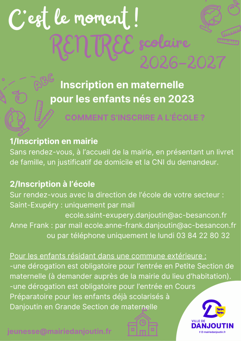 - E-mail : ecole.saint-exupery.danjoutin@ac-besancon.fr ( pour toutes demandes de renseignements ou pour les inscriptions)